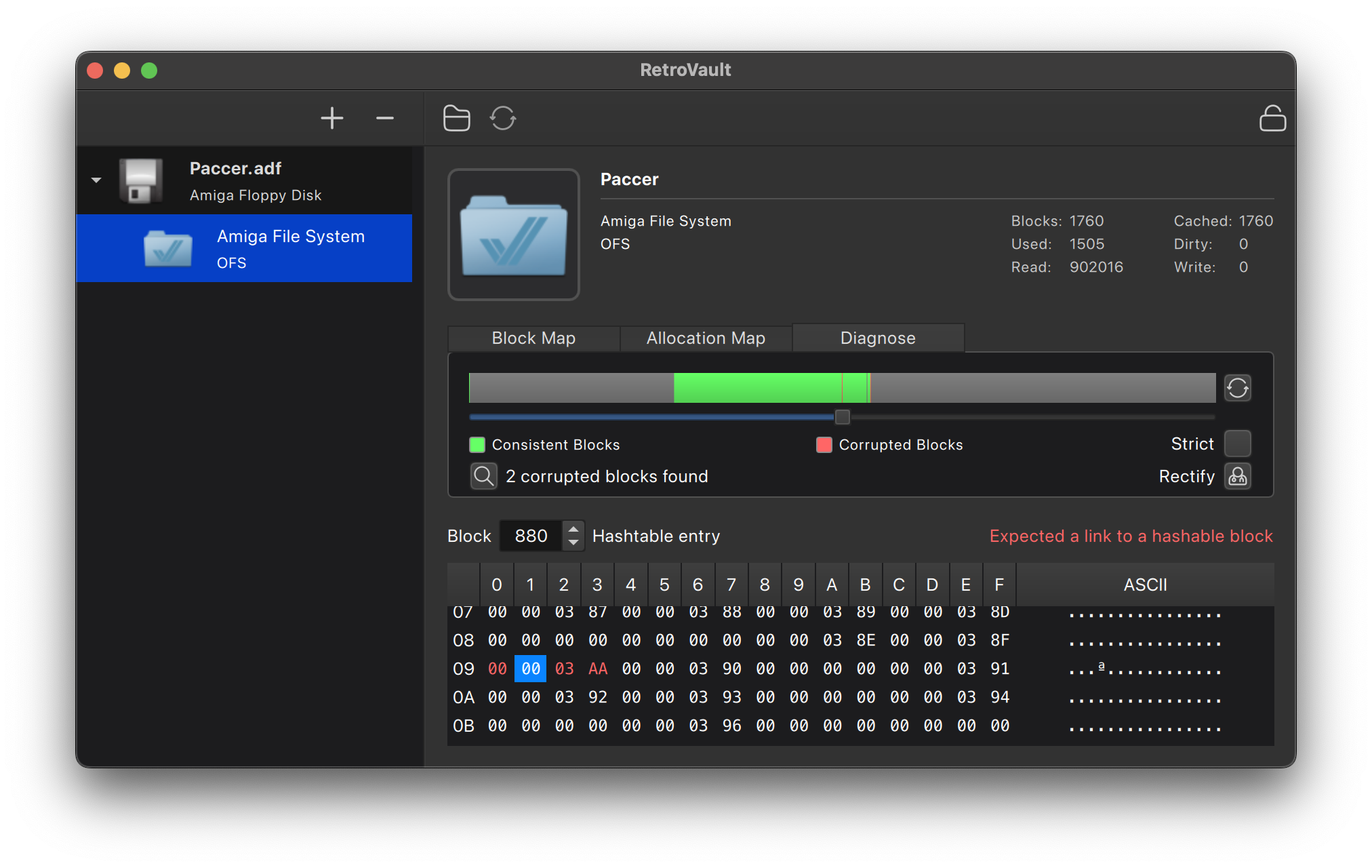In addition, RetroVault offers functionality for analyzing and repairing disk images by inspecting internal file system structures such as block chains, allocation maps, and overall structural consistency. This makes it possible to detect inconsistencies and recover data from damaged or partially corrupted images, which is particularly valuable when working with aging or historically significant media.